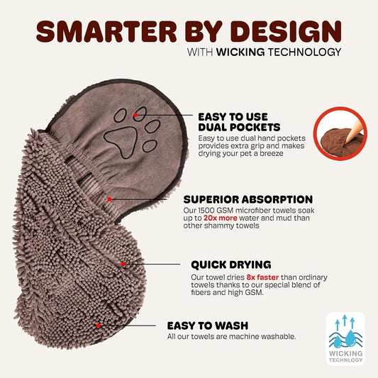 the Dirty Dog Shammy - Fast Drying Plush Shammy Towel with Dual Hand Pockets and Elastic - Super Absorbent Microfiber and Machine Washable - 31×13 In, Grey